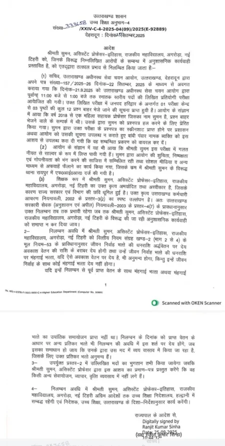 श्रीमती सुमन, असिस्टेंट प्रोफेसर-इतिहास, राजकीय महाविद्यालय, अगरोड़ा, नई टिहरी को, जिनके विरूद्ध निम्नलिखित आरोपों के सम्बन्ध में अनुशासनिक कार्यवाही प्रस्तावित…