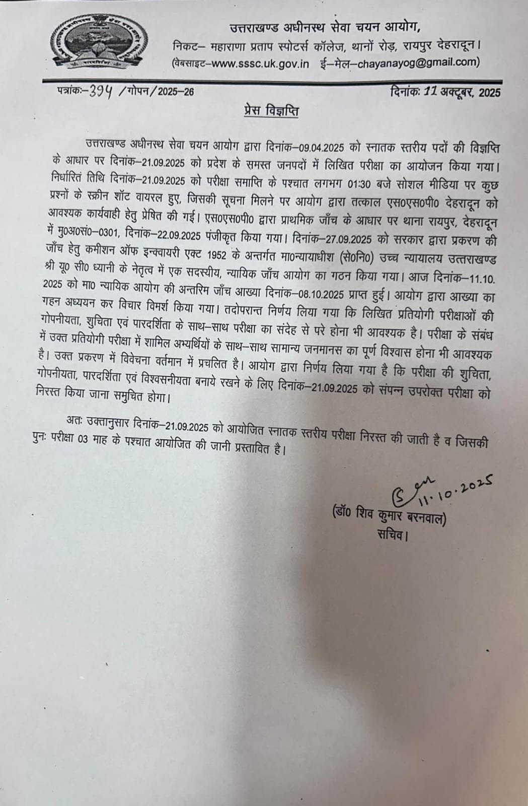 देहरादून: उत्तराखंड में बेरोजगार युवाओं के आंदोलन का बड़ा असर अब साफ दिखाई देने लगा है. लंबे समय से उत्तराखंड अधीनस्थ सेवा चयन आयोग (UKSSSC) द्वारा आयोजित स्नातक स्तरीय परीक्षा के पेपर लीक मामले को लेकर सड़कों पर उतरे युवाओं की मांग मान ली गई है. राज्य सरकार ने 21 सितंबर को आयोजित हुई स्नातक स्तरीय परीक्षा को निरस्त करने का फैसला लिया है. यूकेएसएसएससी के अध्यक्ष जीएस मर्तोलिया के मुताबिक, परीक्षा रद्द हो चुकी है. 3 महीने के अंदर फिर से परीक्षा आयोजित की जाएगी.